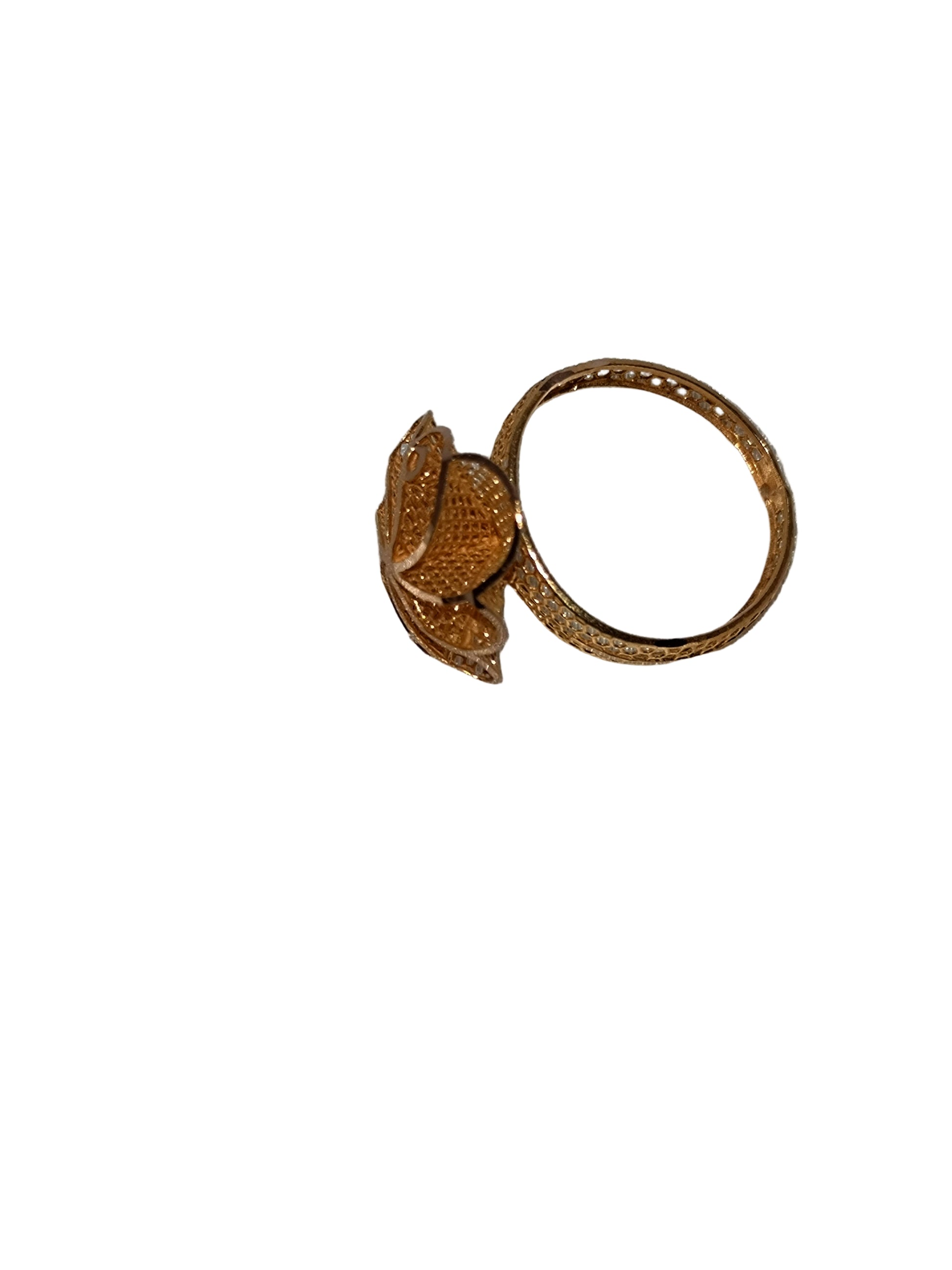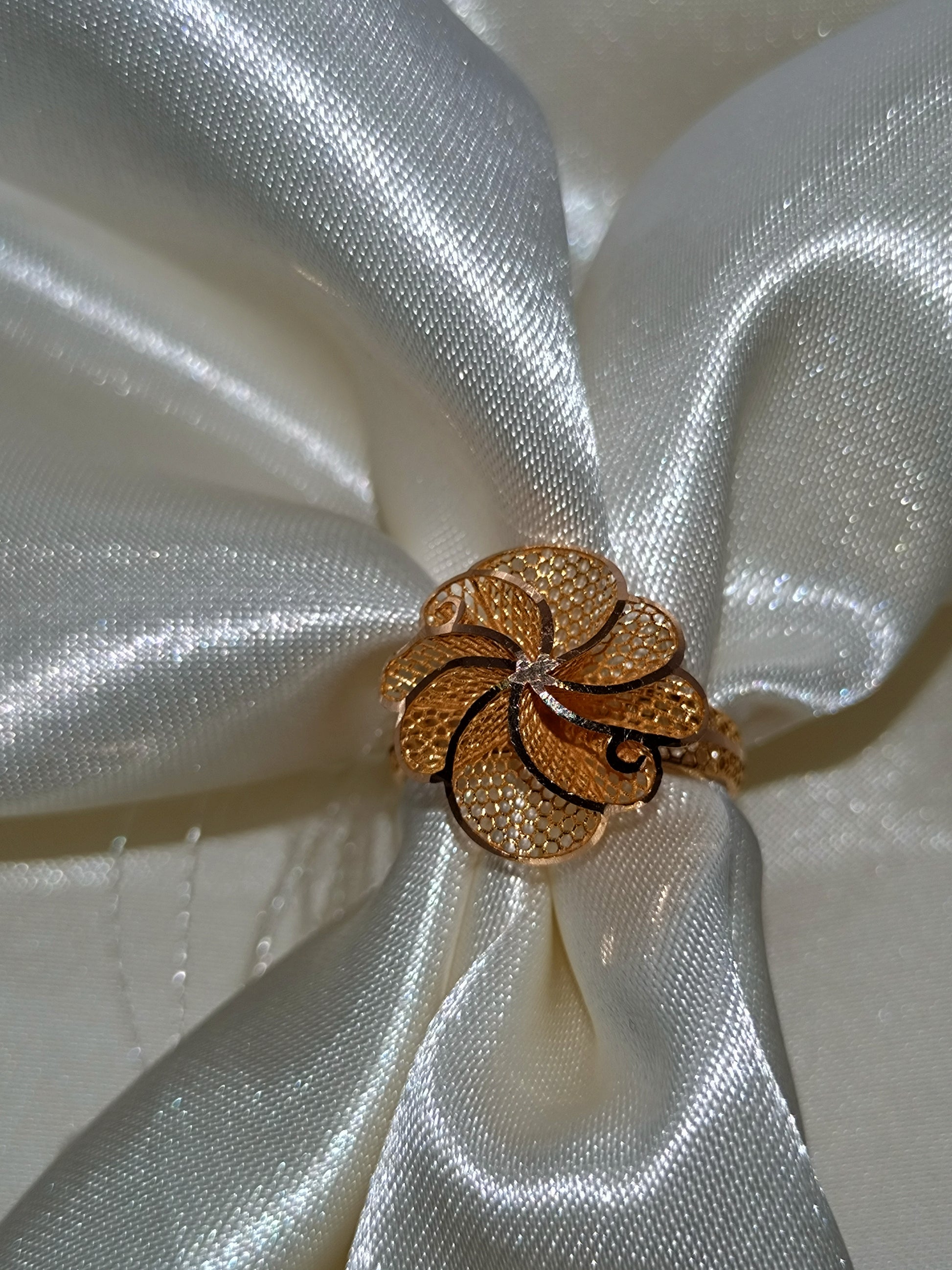 En exklusiv ring i äkta 21 karat guld, designad med elegans och hantverksskicklighet. Ringen har en detaljrik struktur med ett unikt blommotiv som framhäver guldet på ett sofistikerat sätt. Den intrikata graveringen runt ringskenan ger en extra dimension av lyx och gör smycket till en iögonfallande accessoar.
